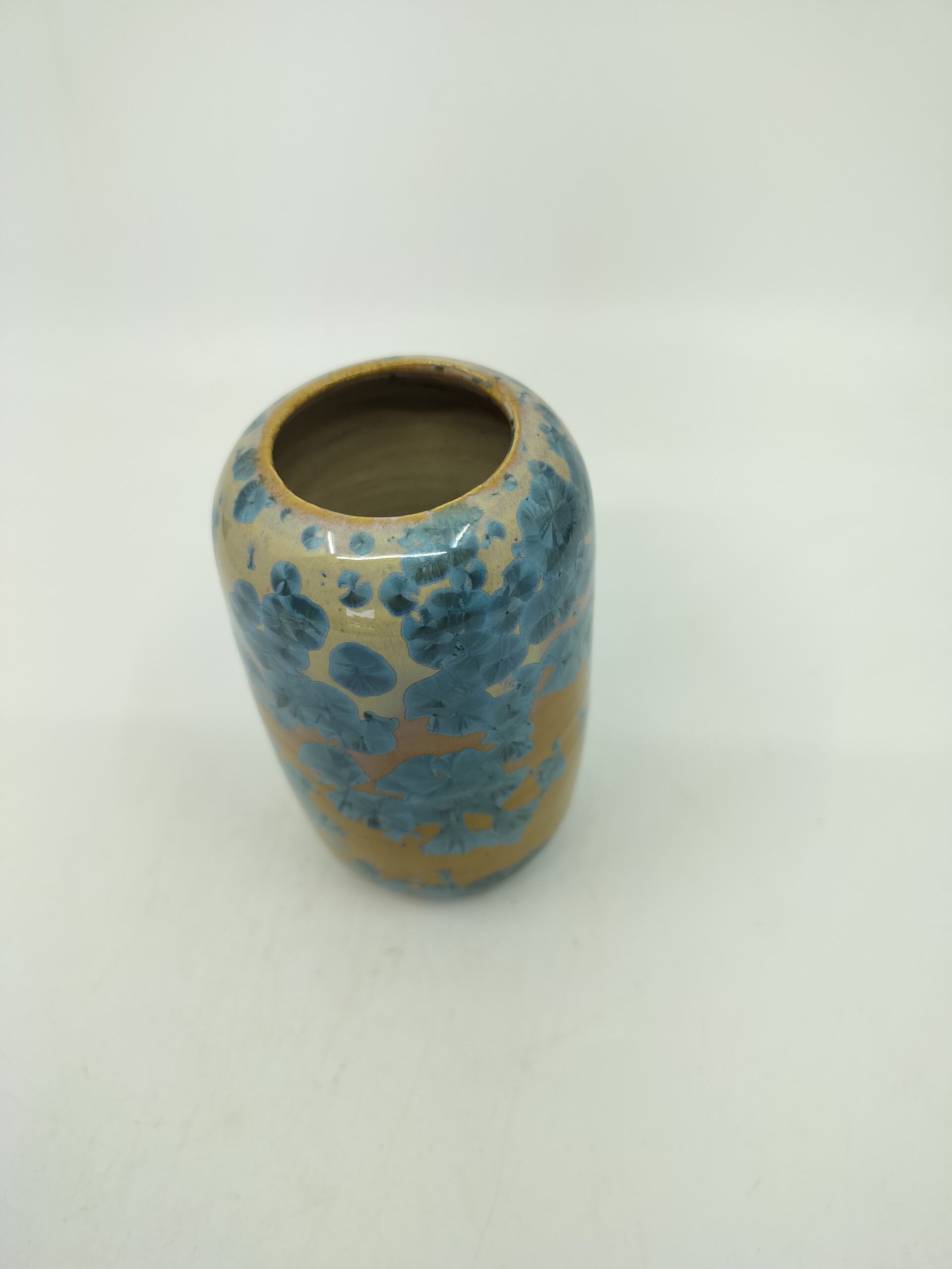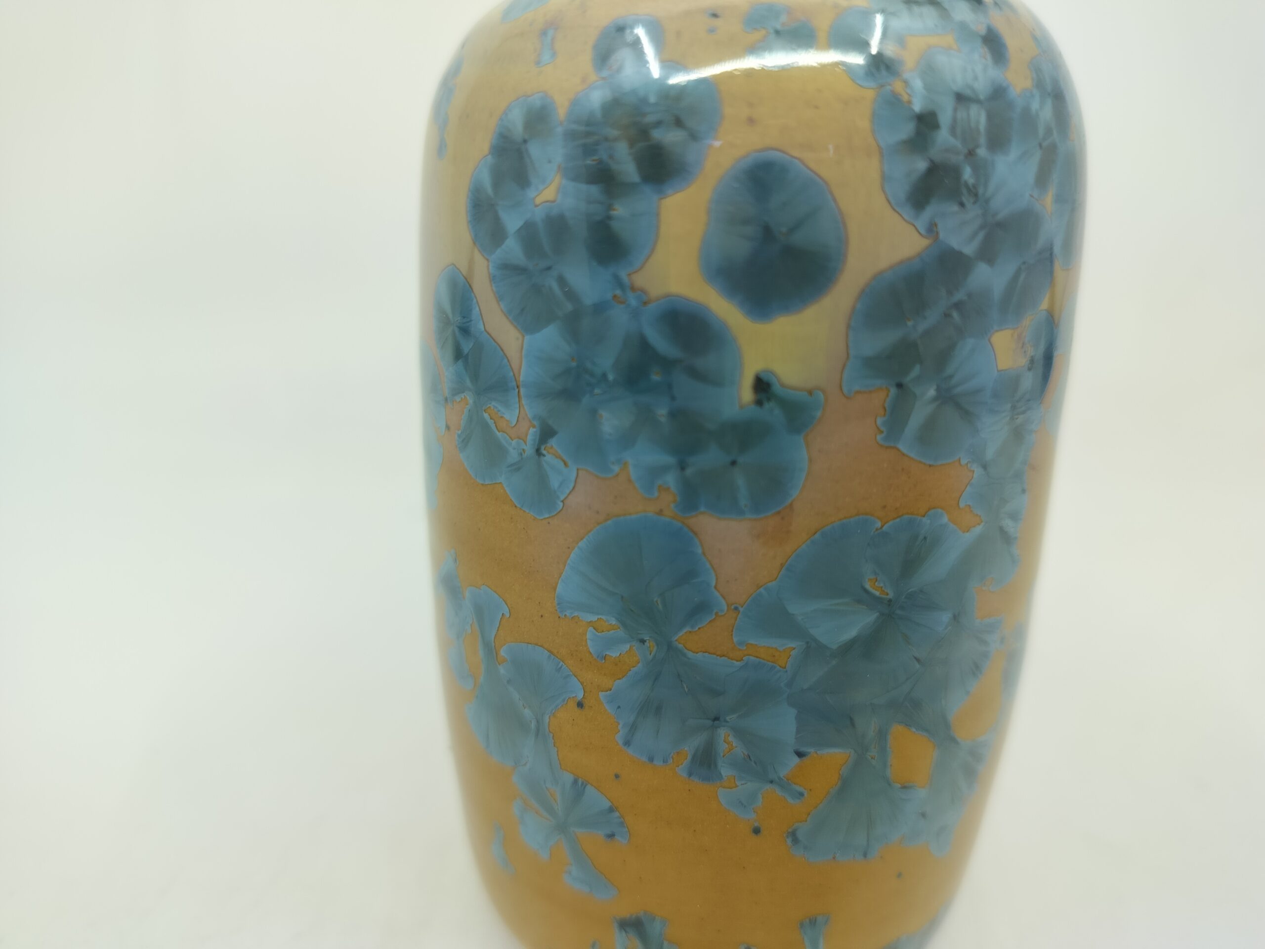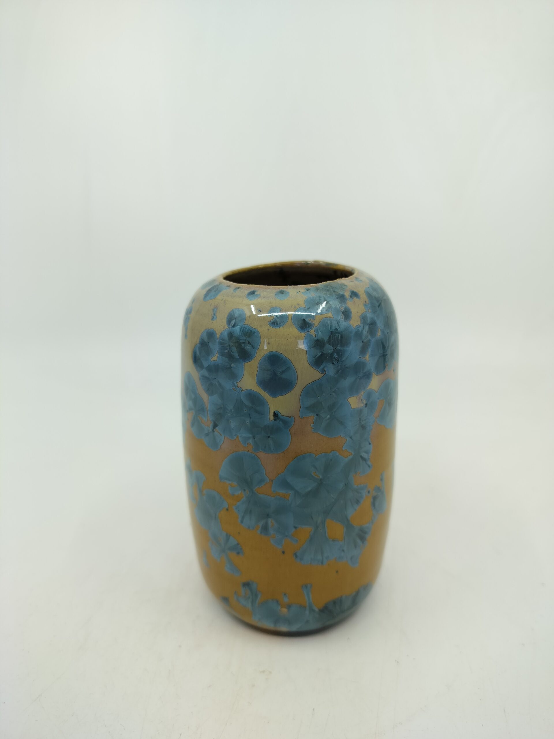 Beautiful vase with blue crystals on orange background that blends Japanese and Scandinavian designs, featuring simplicity and functionality, a love of natural materials, and a deep respect for craftsmanship. Hand-thrown using high quality stoneware on the potter’s wheel. The crystalline glaze is home made using high-quality raw materials. The oxidizating firing with special schedule.