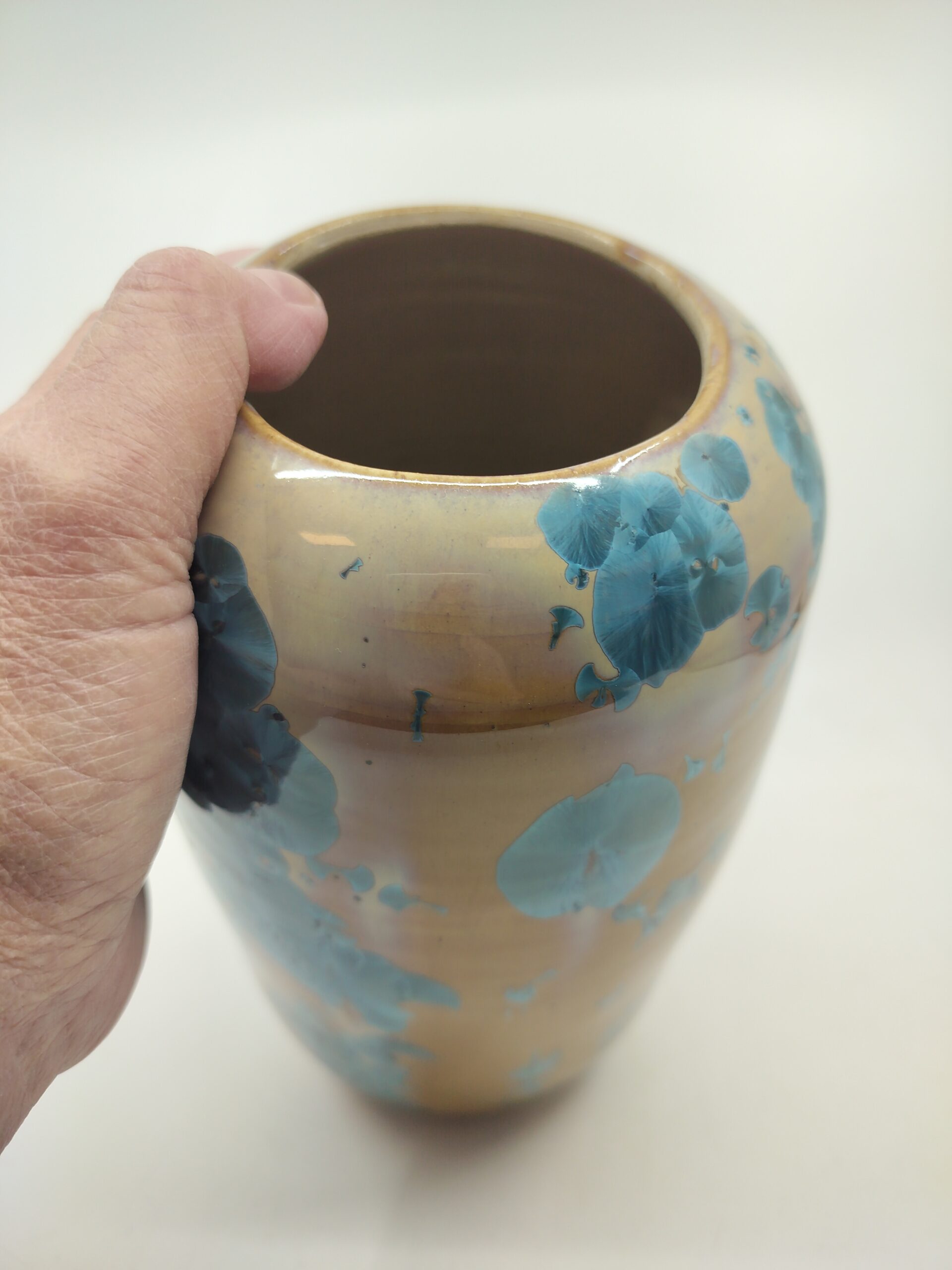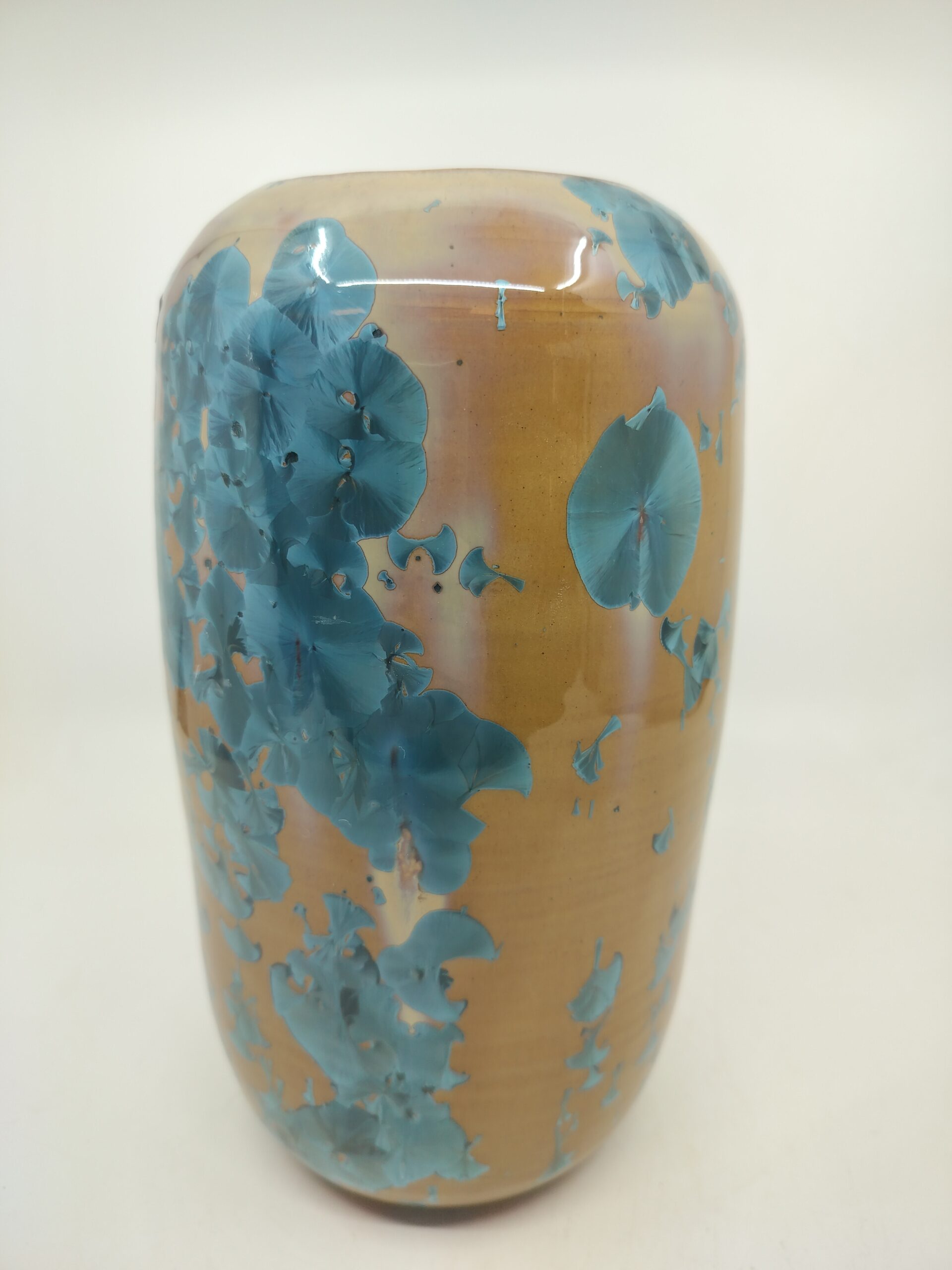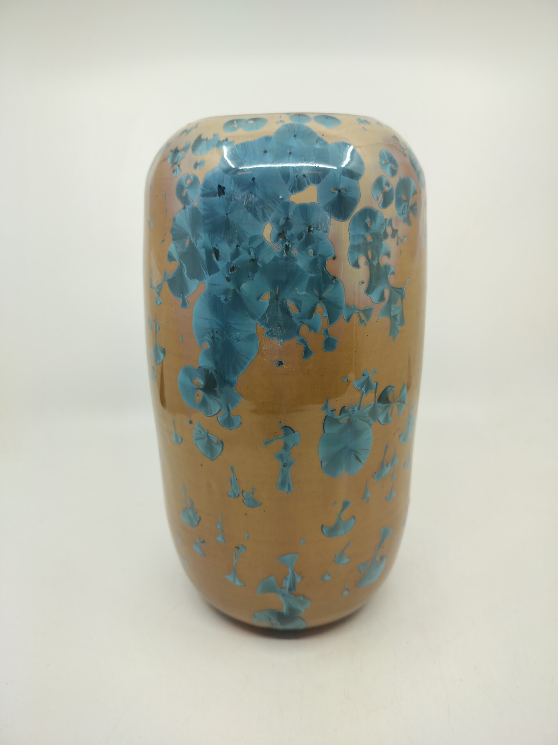 Beautiful vase with blue crystals on orange background that blends Japanese and Scandinavian designs, featuring simplicity and functionality, a love of natural materials, and a deep respect for craftsmanship. Hand-thrown using high quality stoneware on the potter’s wheel. The crystalline glaze is home made using high-quality raw materials. The oxidizating firing with special schedule.