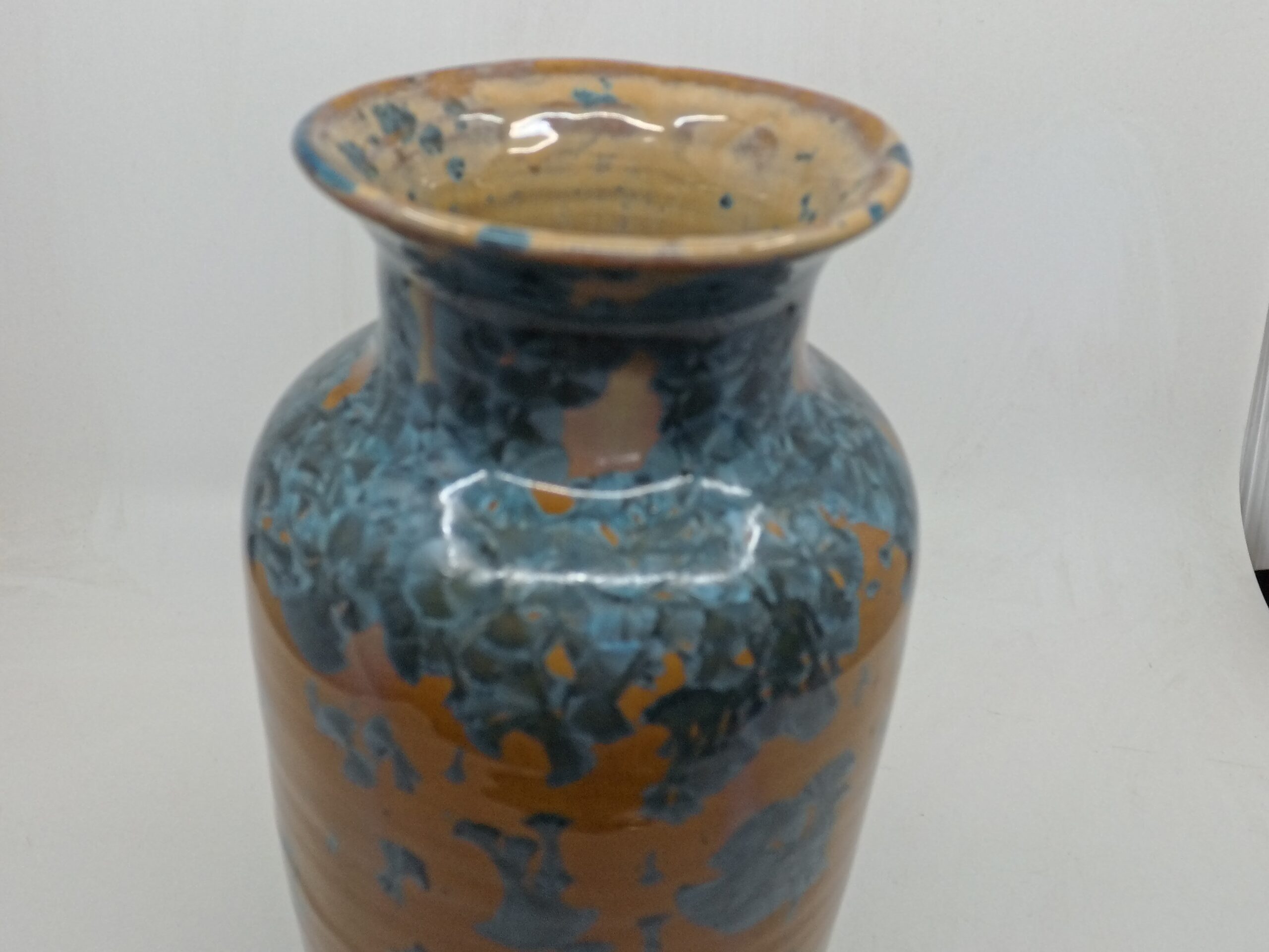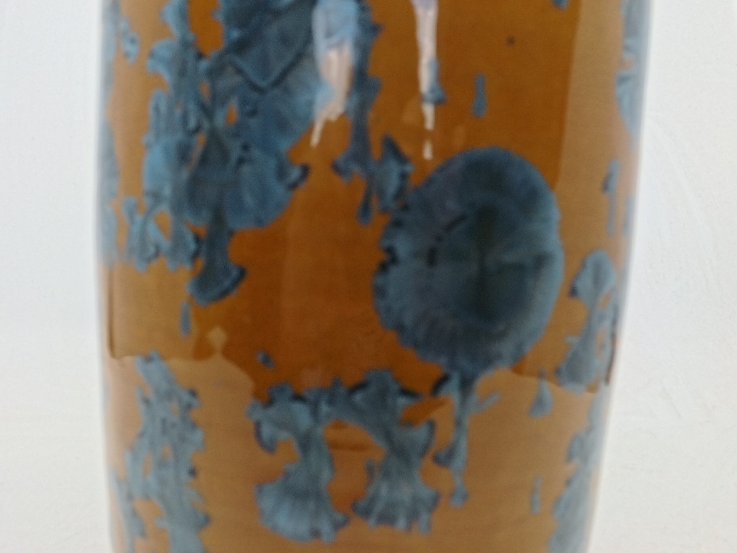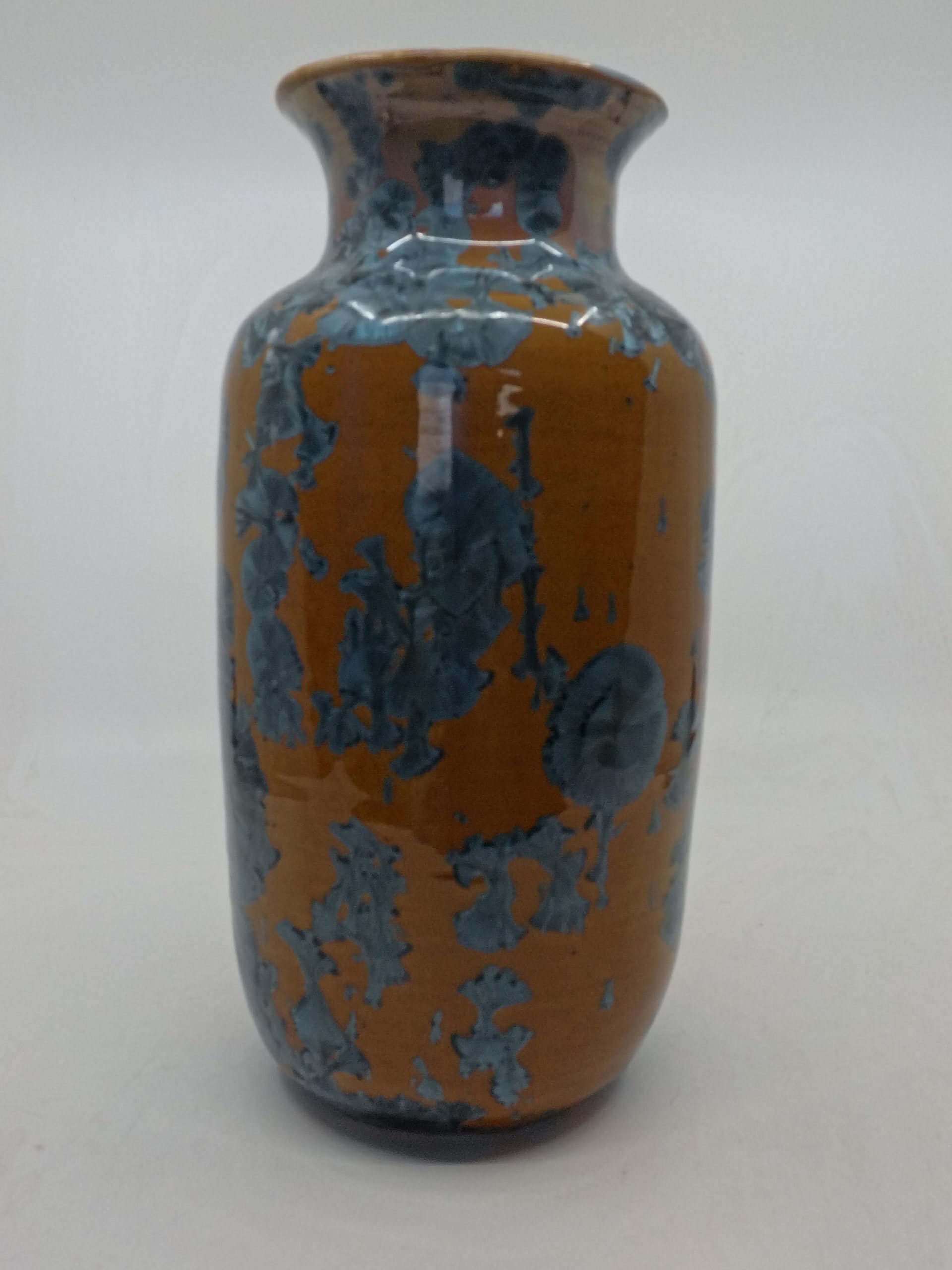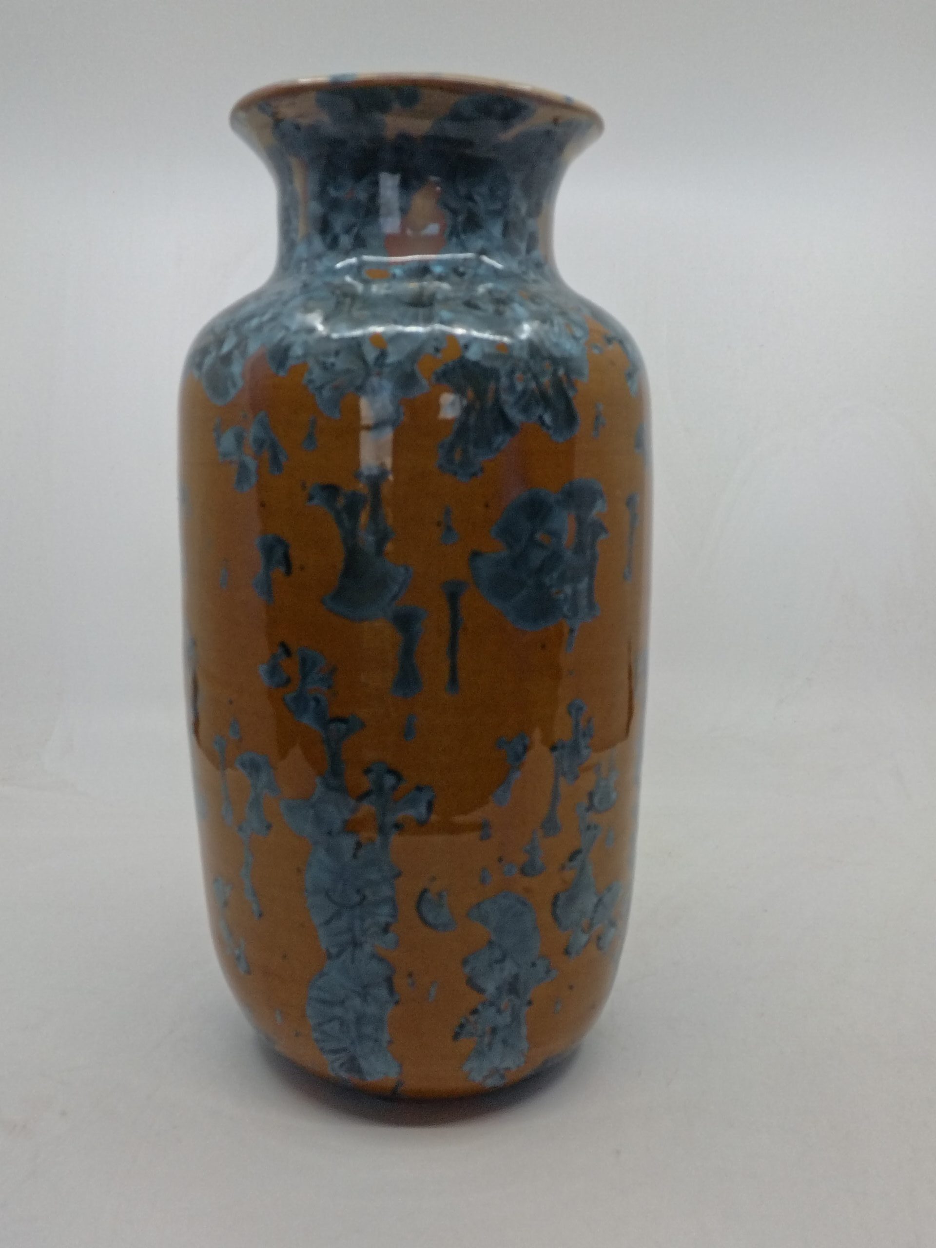 Beautiful vase with blue crystals on orange background that blends Japanese and Scandinavian designs, featuring simplicity and functionality, a love of natural materials, and a deep respect for craftsmanship. Hand-thrown using high quality stoneware on the potter’s wheel. The crystalline glaze is home made using high-quality raw materials. The oxidizating firing with special schedule.