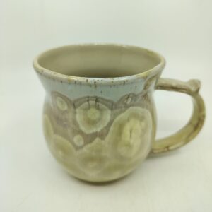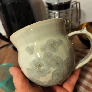 A mug with the Milky Teal glaze, named for its very beautiful teal-colored crystals on milky white background. Transparent glaze is applied inside the mug.