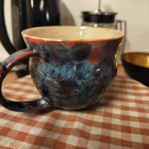The mug is 100% handmade, thrown on my potter’s wheel and a handle with thumb rest is manually attached. The material is stoneware with porcelean slip applied outside, thus making the background color red. It is fired with 20-hour schedule with additional whole day of cooling period.