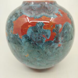 I make a series of simple and modern moon jars, whose size varies from 300g to 6 kg in terms of clay used. This very unique one-of-the-kind collective vase is made with 1kg high-quality stoneware, hand thrown on the potter’s wheel to have a moon-like round shape and porcelean slip applied while it is still wet so that large crystals will grow on the surface. The crystalline glaze of mine used is named Katsura after Cercidiphyllum japonicum, commonly known as Katsura tree, which has leaves with a bronze tint in spring, turning yellow, pink and orange in autumn, when gives off a burnt sugar fragrance. The crystalline glaze is hand blended using high-quality raw materials purchased from Germany, England, and Denmark. The oxidization firing schedule specially designed for this glaze takes 2 full days to finish: the temperature is increased to the top temperature of 1280 celsius as fast as possible so that the glaze melts and runs on the clay surface so that crystal-forming molecules meet together to form “crystal seeds,” then the kiln temperature is lowered to temperatures where crystals can grow larger. In order to make halo effects the temperatures must be controlled up and down. Larger the crystals, the longer it takes to fire. This process is very stressful even for my well-insulated high-quality German kiln, requiring me to change heating elements very often. Generally, successful firing rate is very low for crystalline glaze and this vase is one of the rare success cases. I hope to find a home for this vase who can appreciate this survivor of many steps involved in production.