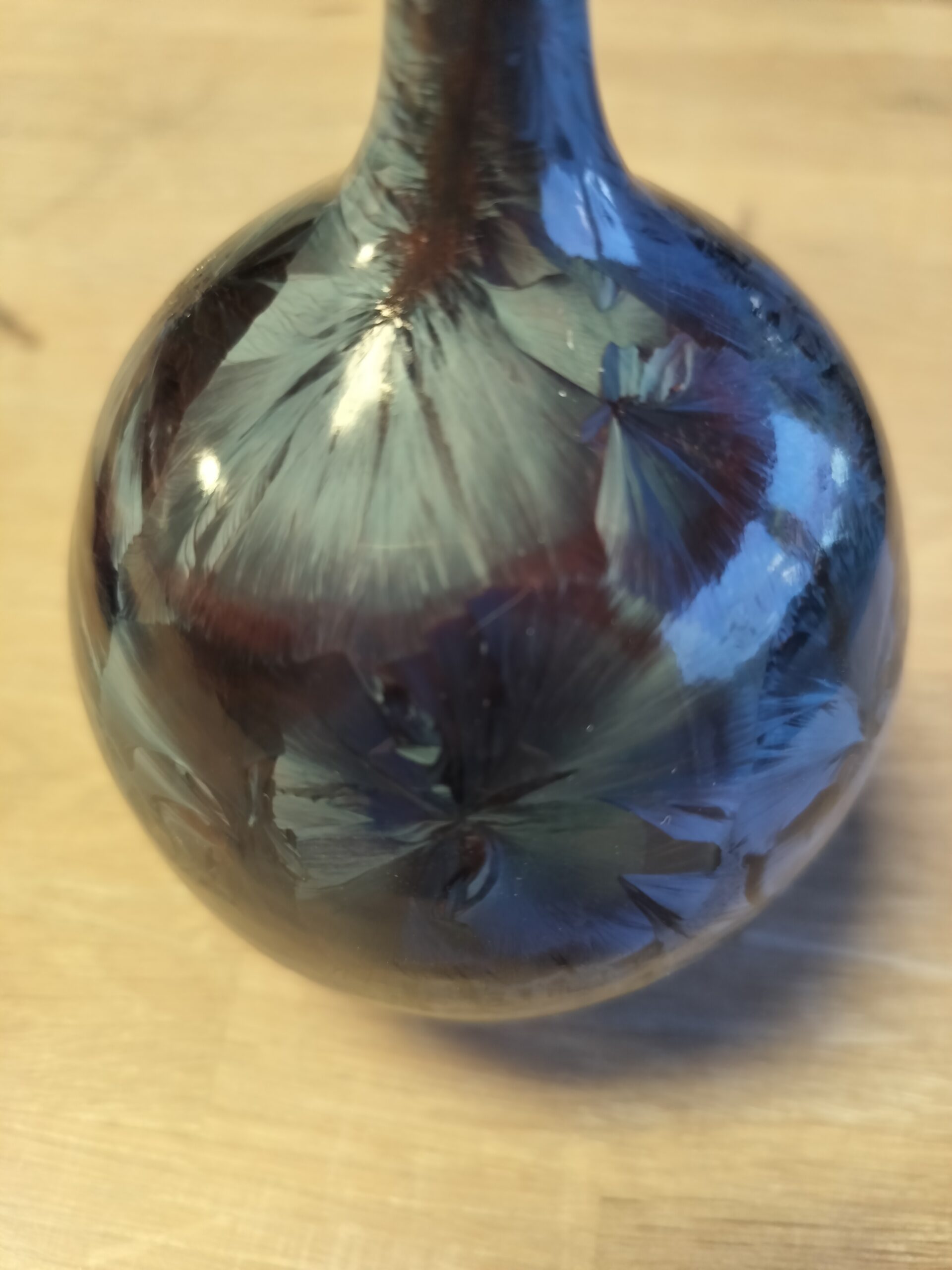 A small beaker-shaped vase with the cryetalline glaze Strelitzia, named for the orange and blue colors similar to the beautiful flower native to South Africa whose common name is bird of paradise flower/plant, because of a resemblance of its flowers to birds-of-paradise. Large blue crystals cover the red background due to red slip applied before firing. Transparent glaze is applied inside the vase. It is one of a series of beaker jars I make with varing sizes, ranging from 300g to 6kg.